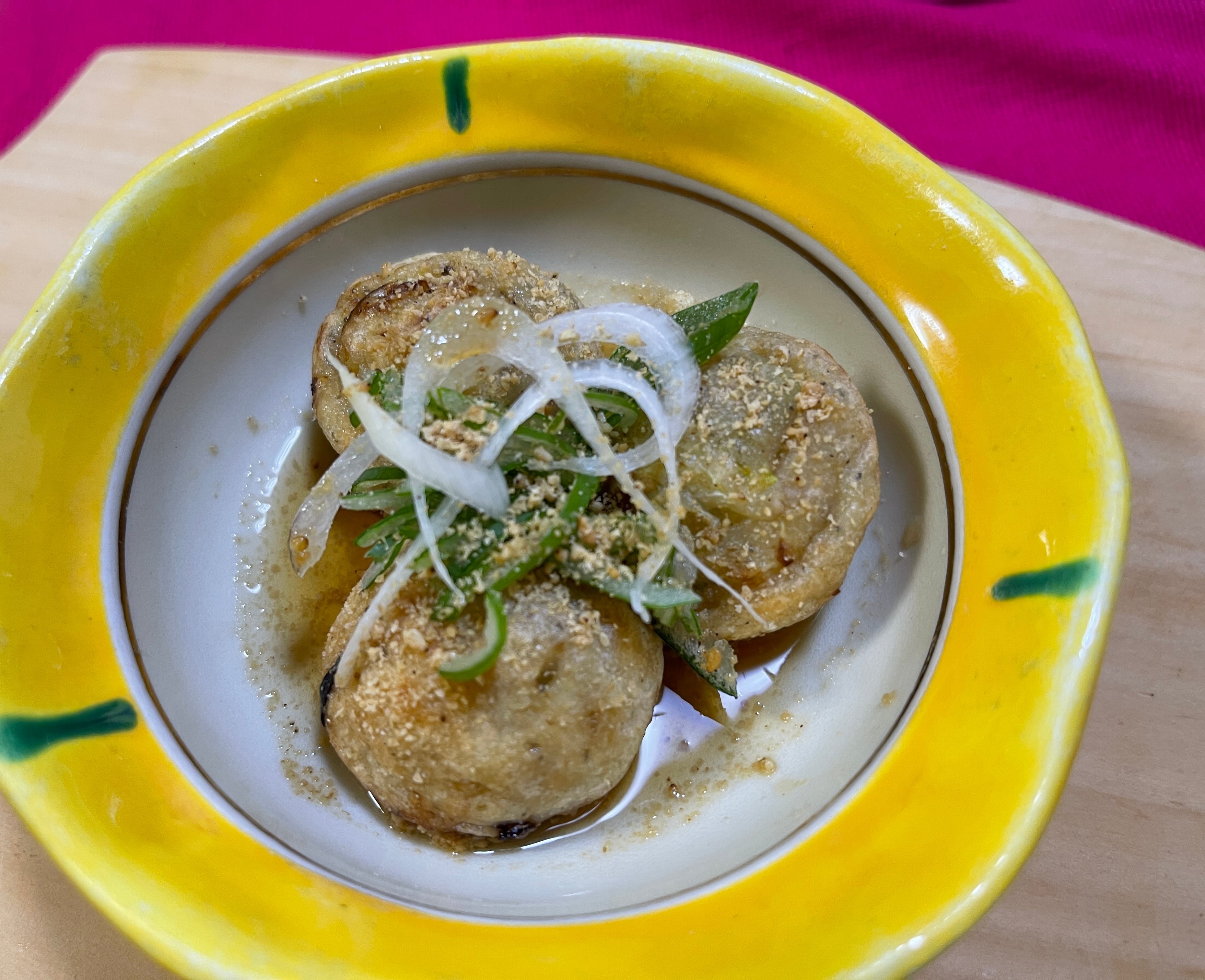 焼きあがったらネギを乗せて、ポン酢をかけて完成